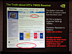 またNVIDIAは,CrossFire対応マスターカードに搭載される,スレーブカードからのデータを受け取るTMDSレシーバが,最高1600×1200/60Hzの対応になっている点を指摘した。要するに,CrossFire動作時は,1920×1200ドットのような高解像度環境を利用できないというわけである。 もし本当だとすれば,これはTMDSというより,DVI 1.0の仕様制限だろう。CrossFireでは,SLIブリッジの代わりにDVIインタフェースを利用する。そして,DVIには「1リンクは最高1600×1200ドット/60Hzまで」という制限がある。だから……というわけだ。 CrossFireシステムを試したわけではないから想像になるが,データ転送にTMDSレシーバを介す以上,アナログ出力時であっても,この制限から逃れられない可能性は高い。仮にこの指摘が正しいとすると,NVIDIAはATIの痛いところを実にうまく突いたといえる。