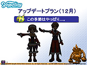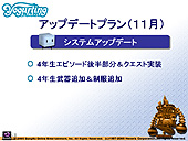 引き続き説明は,10月中旬のストーリーアップデート,11月のシステムアップデートの話題に入る。10月のアップデートでは,4年生前半部分のエピソードとクエストの追加,4年生武器/制服の追加が行われる。 現時点のオープンβサービスでは,3年生までとなっているので,それに続く部分が追加されるわけだ。ステージのスクリーンには新しいブレード,ミューラと思われるアイテムの画像も示された。 また,同じく10月に適用される要素として,インタフェースの改善も挙げられた。これは,右クリックによる視点操作方式の追加と,パワーレベルの表示,ミニマップの改良,クエストウィンドウの独立化といった,改善ポイントから成る。 ヨーグルティングの操作には,W/A/S/Dキーによる視点変更など,やや特殊な部分がある。これを,ごく一般的な操作方法もとれるようにするアップデートは歓迎したいところだ。 続く11月のアップデートでは,4年生後半部分のエピソードとクエスト,4年生武器/制服のさらなる追加が予定されている。そして12月のアップデート説明では,クリスマス用の衣装を身に着けたキャラクターのシルエットのみが示された。