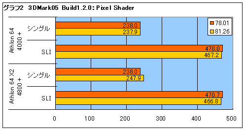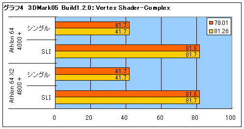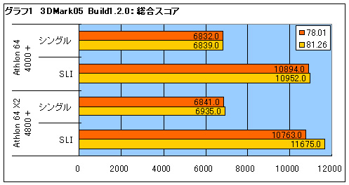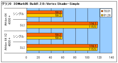 3DMark05 Build120の結果から解説しよう。まずはグラフ1を見てほしい。シングルコアの4000+でも78.01よりは81.26βのほうがスコアが高くなっているが,上昇率は1%に満たない。この程度の上昇であれば,単純にドライバのチューニングが進んだことによるものだと判断できるだろう。 しかしデュアルコアの4800+は,明らかに4000+よりもスコアが高い。シングルカード時では1%弱の上昇に留まるが,NVIDIA SLI動作時のスコアの上昇率は9%にも達する。単純なチューニングの結果や計測誤差によるものとは見なしえない差だ。 デュアルコアCPUに対応していないプログラム(グラフィックスドライバも一種のプログラムである)を動作させた場合,デュアルコアCPUを使ったとしてもCPUコアは片方しか使われない。つまり,4800+のスコアは4000+のスコアとほとんど同じになるはずなのだ。ここで有意な差が出たということは,二つのドライバでデュアルコアCPUの生かし方が異なるということだ。