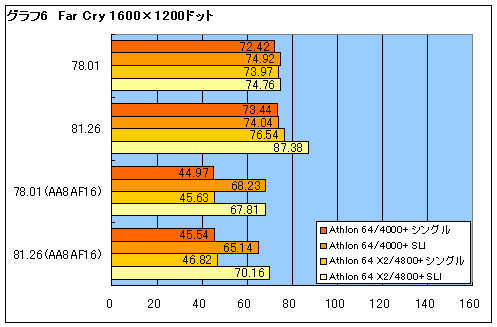 DOOM 3の結果がグラフ7,8である。4000+では78.01から81.26βで,1%以下のごくわずかな上昇に過ぎないが,4800+では最大11%の上昇率となっている。DOOM 3では,解像度を上げたりアンチエイリアシングや異方性フィルタリングを適用したりすると極端にフレームレートが低下し,ドライババージョンによるパフォーマンスの違いがまったく表れなくなった。