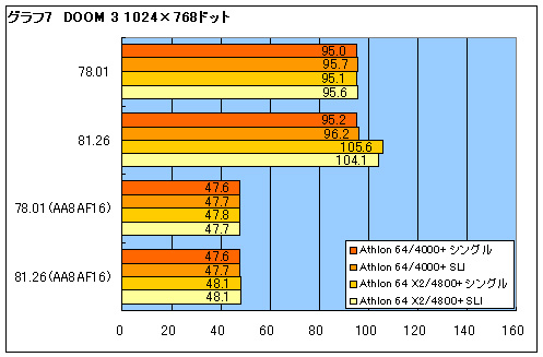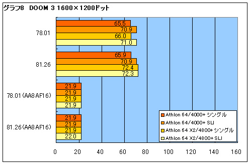 次に3DMark05以外でどれくらいの効果があるのかを,実際のゲーム「Far Cry」と「DOOM 3」で調べてみた。 Far Cryの結果をグラフ5,6に示す。4000+では78.01から81.26βで1.5%ほどのフレームレート上昇に留まっているのに対し,4800+では最大で20%もの上昇率となっている。解像度を上げたり,アンチエイリアシング(8x。グラフ中ではAA8と表記)と異方性フィルタリング(16x。グラフ中ではAF16と表記)を適用したりと,グラフィックスチップに負荷をかけた場合,グラフィックスチップ側がボトルネックとなるため,差は小さくなる。