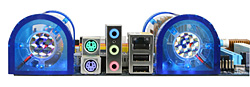 Turbojet Technologyのキモは,その一種異様な外観を演出している円筒状の2連クーラー「デュアル スラスター クーラー」だ。デュアル スラスター クーラーはユニットごとに2個,計4個のファンを搭載し,CPUとノースブリッジ,メモリを効率よく冷却すると同時に,ケース内の暖まった空気をPCケース外へ排気することで,熱による問題が発生しないよう配慮されている。