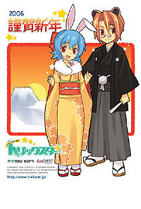 年賀状データの絵柄は,「バニー」と「ラクーン」が着物姿で並んでいる描き下ろしのイラスト。配布期間は2006年1月10日までとなっているので,これから年賀状のデザインを考えようとしている人や,すでにトリックスターで知り合った友人に年賀状を送るのを決めてしまっている人(?)は利用してみるといいかもしれない。ちなみに,PDF形式のデザインテンプレートで配布されるので,Acrobat Reader(またはPDF形式のデータが読み出せるアプリケーション)が必要となる(Acrobat Readerは特設ページ上からダウンロード可能)。
