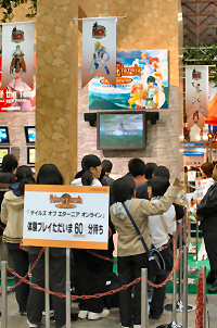 この両日,ナムコはテイルズ オブシリーズが10周年を迎えた(第一弾は1995年12月に発売されたスーパーファミコン用ソフト「テイルズ オブ ファンタジア」)ことを記念し,とにかくテイルズ オブシリーズづくしのブースを設置。プレイステーション2用に12月15日に発売されたばかりの「テイルズ オブ ジ アビス」,ニンテンドーDS用に2006年発売予定の「テイルズ オブ ザ テンペスト」のほか,シリーズ初のPC用タイトルで,なおかつシリーズ初のMMORPGであるTOEOの姿も確認できた。