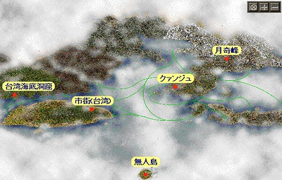 ※コースの地図: 無人島スタート(イベント村)→クァンジュ(朝鮮)→月奇峰(朝鮮特集地形)→台湾海底洞窟(特集地形)→市街(台湾、近道利用)→市街ゴール(朝鮮)