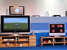 右:Core Duo搭載の小型エンターテインメントPC(テレビの向かって右脇)で「フロントミッション オンライン Windows版」をプレイしつつ,別のホームネットワーク対応テレビからこのPCを使って音楽ビデオのストリーミングを行うデモ。ゲームもストリーミングも滑らかに動作していた
