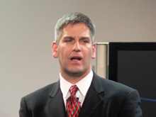 右:同じく,こちらは米本社のデジタルホーム事業本部副社長兼事業本部長のDonald J. MacDonald(ドン・マクドナルド)氏。Centrino Duoによって,ノートPCでもゲームや動画配信などの本格的なエンターテインメント体験が楽しめるようになると述べた