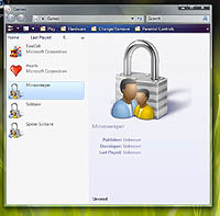 このGamesをクリックすると表示されるのが,Vistaで新採用された「Games Explorer」という専用ブラウザだ。これまでは,デスクトップにショートカットがないときには“スタート”の“すべてのプログラム”からゲームファイル,そして場合によっては販売元のフォルダをオープンしてからようやくゲームアイコンにまでたどり着くという作業を行わなければならなかった。 Games Explorerには,販売元のフォルダもなく,直接ゲーム起動アイコンをマネージできるという点で,Media Playerのような感覚に発展させたわけである。それぞれのゲームには販売元や開発元,ESRB(Entertainment Software Rating Board)のレーティングシステム,そして公式ウェブサイトへのリンクなどの情報が表示されている。 ゲームソフトのインストールも簡単になるらしく,ムーア氏は「Plug & Playの実態をコンシューマ機と同じくらいにしなければ,ゲームプラットフォームとしてのウィンドウズは敬遠されたままになる」と説明する。カジュアルゲームも配慮されており,ソリティアやマインスウイーパのグラフィックスが大きく向上したほか,チェスゲームもデフォルトで用意されることになった。
