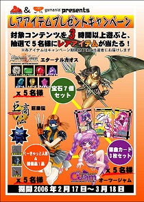 ○キャンペーン説明 【内容】 公認ネットカフェにて、対象コンテンツを3時間以上遊ぶと、キャンペーン終了後に抽選で各タイトル5名様にレアアイテムが当たります。
