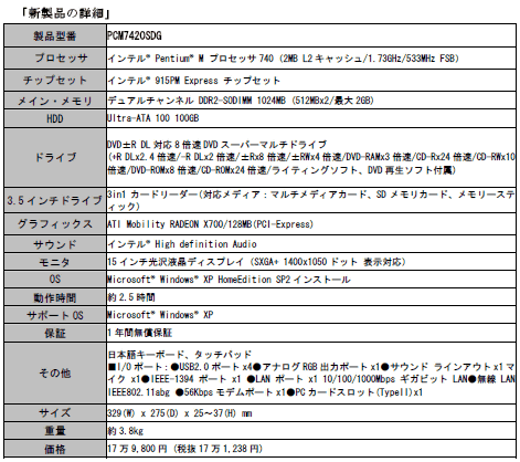 グラフィックスチップがMobility Radeon X700なので,最新の3Dゲームを満足にプレイするには少々力不足だが,逆にいえば,それ以外なら快適にプレイできるはず。2006年2月24日から販売開始とのことなので,気になった人は発売日以降,近所のヨドバシカメラ店頭で触ってみてはどうだろうか。 なお,主なスペックはプレスリリースから以下のとおり抜粋したので,参考にしてほしい。(佐々山薫郁)