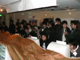 左:試合中は観戦者もモニターに釘付け状態。プレイをしている人にアドバイスをする姿も 中央:対戦終了後には,空クジなしの抽選会を開催。賞品はゲーム内のアイテムだけでなく,リストウォッチなど実際に身に着けられる賞品もあった 右:ガンホー・オンライン・エンターテイメント,第二マーケティング部小島幸博氏も訪れ,ライブカメラを通じ大阪会場へ挨拶をする一幕も