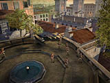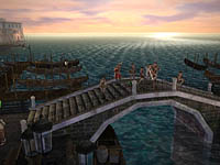 左:港前広場に置かれたモニュメントは,ブリスティア海軍「無敵艦隊」の集中砲火を受けて沈んだ,ベスパニョーラ海軍「赤色艦隊」旗艦の錨だとか 中央:街中にあるカフェ「セイウチ」。看板娘のリサリンウェイは,喧嘩と火事場見物が好きという江戸っ子(?)。店の前にはNPC「セイウチマニア」という少年がいたり 右:コインブラの全体マップ。中央部分には噴水とベンチが置かれ,街を見下ろせる高台になっている