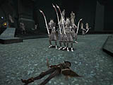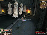 上段:「ジャケン トートーチャーチェンバ」は,ジャケン収容所の中でもかなりの強敵が出現するエリアだ。モンスターの平均レベルは70〜80で,用意されたレベル52のキャラ1体ではまず適わない。3対1で,ようやく倒せた 下段:さらに深部まで走り抜けてみた。収容所らしい暗く閉鎖的な雰囲気のマップは,部屋数も少なくほぼ一直線の作りだ。この後,回復剤を使っても間に合わずに即死した
