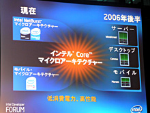 Chandrasekher氏は続けて,次世代CPUの基本設計思想であるマイクロアーキテクチャについて説明を行った。それによれば,Intelは2006年後半に,「インテル Coreマイクロアーキテクチャー」と呼ばれる新しいマイクロアーキテクチャを採用したCPUを,デスクトップ/モバイル/サーバー分野に向けて出荷する予定だ。 このあたりは一部すでにお伝えしているが,開発コードネームは順に「Conroe」(コンロー),「Merom」(メロム),「Woodcrest」(ウッドクレスト)。Pentium 4とPentium Mはデスクトップとモバイルでまったく異なるアーキテクチャのCPUだったが,次世代CPUでは,同じCoreマイクロアーキテクチャーを採用する。なお,先述したCore Duoは,同じ“Core”の名前を用いているが,Coreマイクロアーキテクチャーによるものではない。むしろ,CoreマイクロアーキテクチャーのベースになるのがCore Duo,くらいのイメージで捉えておくといいかもしれない。
