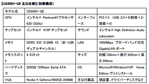 ちなみに,同製品はBTO(≒購入時のスペックカスタマイズ)が可能で,最小構成だと,Pentium 4 630/3GHzにPC2-4200 DDR2 SDRAM 512MB×2,GeForce 7600 GS搭載グラフィックスカードにHDD容量200GBといった構成。これで価格は11万9980円(税込)となっている。このほか主なスペックは以下のとおりだ。