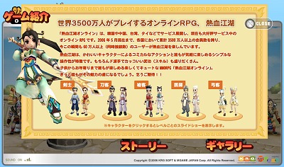 熱血江湖 Onlineは,韓国の人気コミック「熱血江湖」を原作とし,韓国MGAMEと中国KRG Softの共同制作によるMMORPGで,韓国,中国,台湾,タイの4地域でサービスが始まっている。エムゲームジャパンによれば,熱血江湖 Onlineは累計で3500万人の会員数を誇るアジアNo.1のMMORPGであるという(アジアNo.1であれば世界No.1であるような気はするのだが)。同時接続数は,実に60万人に上る。昨年の大韓民国ゲーム大賞では大統領賞,人気ゲーム賞を受賞している話題作である。