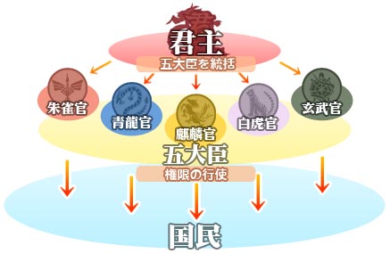 朱雀官 貿易や商業の経済バランスをつかさどる大臣です。貿易商人などから買い取る価格などを一定限度数内で設定し世界の通貨流通量を調節することができます。