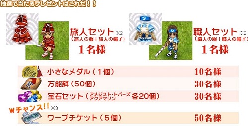 ※2 旅人セットと職人セットは配布されてから7日間の使用期間がつきます。期間が経過すると服、帽子アイテムは消滅しますのでご注意下さい。