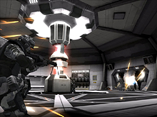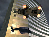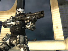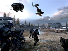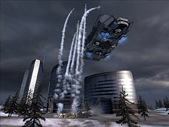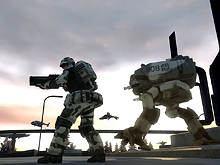 さて,前述のようにバトルフィールド2142の舞台は未来,つまりSF戦争だ。これに関しては,ファンサイトやフォーラムなどでも賛否両論だった。これまで同シリーズでは,実在する軍隊と実在する兵器を使った戦争をテーマにしてきただけに,この転身に難しい気分を抱いている人(含筆者)も結構いるようだが,実際に動いている画面をこの目で見,キーボードに触れてみると,これはもう間違いなくバトルフィールドシリーズだった。 BF2のグラフィックスエンジンを使った画面はリアルで美しく,飛び交う未来スタイルの戦闘機や,地上兵器などの迫力も満点であり,事前の懸念を払拭する出来栄えに思わず感心する単純な取材班である。