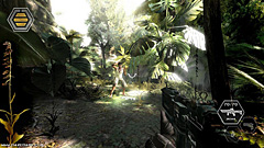 撮影不可のデモセッションで,プレイヤーは3人のBOTキャラクターとチームを組んでおり,4人の傭兵が乗るヘリコプターが滝のあるジャングル地帯に着陸し,すぐに銃撃戦を開始していた。ジャングルの戦闘シーンは「Far Cry」あるいは「Crysis」といった,高いクオリティだ。セッション自体は非常に短く,ゲームの完成度もまだα版程度と思われたが,非常に滑らかに展開しているのは好感が持てる。 注目したいのは,銃の照準であるレティクル(十字線)が4色に分かれていた点だ。この4色はプレイヤーキャラクターと,ほかのBOTキャラクターそれぞれの識別色と1対1の関係になっており,どうやらなんらかのコマンドで,BOT達に指示を出したりするようだ。デモではBOTに対して的確に指示を与えながら,ジャングルの奥から狙撃してくるゲリラに対し,手榴弾を投擲したり回り込んだり,一斉射撃したりしながら追い詰めていっていた。このあたり,どういった指示システムがあるのかは,今後のお楽しみといったところかもしれない。