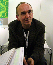 Molyneux氏もそうだが,Will Wright,Richard Garriottなどに共通しているのは,決して奢らず高みに立たず,こちらの話を真剣に聞いて,真剣に答えようとしてくれるその態度。やはり一流は違う。ちなみに,握った右手にチラリと見えるのは爪楊枝入れ。ヘビースモーカーの彼にとって,アメリカで行われるE3は地獄。どうにも外に出られないときは,爪楊枝(ハッカ味)をくわえて気を紛らわせる