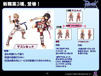 今回のアップデートでは地域的な拡張は最小限に留まるが,その一方で新職業と新しいホムンクルスが追加される。目玉となるのが新職業「テコンキッド」だ。 これは韓国の有名な武道テコンドーを駆使する格闘家的な職業で回し蹴り,跳び蹴り,かかと落としなど脚を武器にして戦うため,武器は装備できない。また,身に着けられる防具は基本的に,ノービス用が中心となる。戦闘以外でも,塀などマップ上の障害物をジャンプで越えられるといった特技を持つ点も新しい。