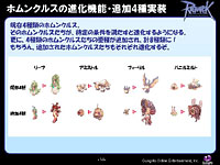 新職業と並んで重要なのが,ホムンクルスの進化システムと,新ホムンクルス4種だ。ホムンクルスの進化には条件があり,それは召喚者との関係が「きわめて親しい」まで行っていることと,「賢者の石」(ジェミニS58などの敵が稀にドロップする)を手に入れて使うことだ。 進化したホムンクルスはHP/SPの最大値が伸び,各種ステータス値も上昇して,奥義スキルが習得可能になる。そして,グラフィックスもより豪華に,強そうな雰囲気になる。 新ホムンクルス4種について,カンファレンスでは名前も特徴も明かされなかったのだが,スライドと資料で示された範囲では,既存の妖精型「リーフ」の亜種,同じく動物型「アミストル」の亜種,鳥型「フィーリル」の亜種と,バイオクリーチャー型(?)「バニルミルト」の亜種といったラインナップになっているようだ。