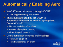 1600MB/sというメモリ帯域幅を実効レベルでクリアしている必要があり,それをチェックするため,一般ユーザー向けにはWindows Vista Upgrade Advisorが提供される。ちなみに,MicrosoftのOEMとなるPCメーカー向けには,「Aero acceptance test」(AeroAT)が提供される予定
