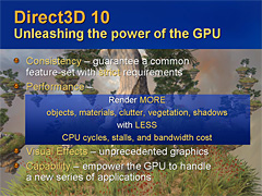 なお,上でも述べたとおり,ゲーマーにとってより重要なのはDirectX 10というより,Direct 3D 10なのだが,セッションでは“DirectX 10=Direct 3D 10”として扱っていたため,本稿でもこれに従うことを,あらかじめお断りしておく。