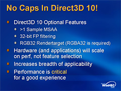 「DirectX 10では,この理不尽を排除し,DirectX 10の仕様の一貫性(Consistency)を保証する。開発者は,どのDirectX 10世代グラフィックスチップを使っても,すべてのフィーチャーを利用できる。Windows Vista世代では,Direct 3D 10グラフィックスは,家庭用ゲーム機のようなコンセプトになったと考えてもいい」とはGlassenberg氏の弁。