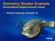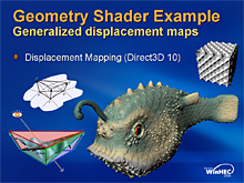 この場合,ジオメトリシェーダを用いれば,こうした法線マップ(テクスチャ)を読み出して,これを“タネ”に頂点を生成して「本物の凹凸」を作り出す,ディスプレースメントマッピング処理が可能だ。これを応用し,視点からの距離に応じて,遠いときはバンプマッピング,近いときはディスプレースメントマッピングといったようなLOD(Level Of Detail)処理を行えば,リアルな表現を効率的に行えることになる。