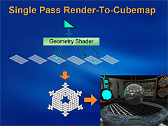 ジオメトリシェーダを活用すれば,シーンをキューブマップとしてレンダリングする動的なキューブマップ生成をシングルパスで実行可能