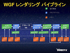 DirectX 10が,コードネーム「WGF」と呼ばれていた時代のレンダリングパイプライン図がこれ。上の図でも示されているように,「テッセレータ」は最終仕様のDirectX 10から排除された