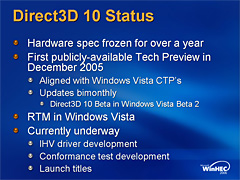 また,DirectX 10世代のグラフィックスチップは,Windows Vistaが発売される2007年1月に同時発表&リリースといわれている。当初は,「Windows Vistaリリース後,DirectX 10世代グラフィックスチップ不在の時間が続き,登場するのは結局2007年中旬となる」とささやかれていた。しかし,WinHEC 2006を迎えた2006年5月現在,マイクロソフト関係者は皆,口を揃えて「Windows Vistaと同時リリース」と言っており,何かしらの目処は立ったと見るべきだろう。