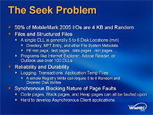 右:こちらのスライドでは,PCオペレーションにおける体感性能において,HDDのランダムアクセス性能が支配的であると主張されている。「MobileMark 2005」というノートPC向けベンチマークテストでは,ディスクアクセスの50%が4KBサイズのランダムアクセス読み出しだったとか