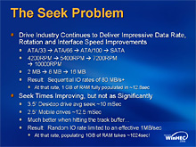 左:HDDは高速化されているが,ランダムアクセス性能の根幹であるシーク性能は,HDDが機械装置であるという構造的な制約のため,ほとんど高速化されていないことを示すスライド