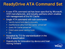 ReadyDrive対応の「ハイブリッドHDD」(Hybrid HDD,H-HDD)は,Microsoftが策定した新しいATAデバイス制御コマンドを使って駆動する。このため,Windows Vista側からReadyDriveにあるフラッシュメモリの内容を明示的に直接制御したりといったことが可能になる。ReadyBoostよりもシステムに密着した形で制御が行えるようになるのだ。