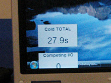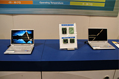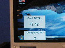ブースでは,1.8インチHDDと1.8インチSDDをそれぞれ搭載した2台のSamsung Electronics製ノートPCを展示し,Windows Vistaの起動時間競争や,複数のMicrosoft製オフィスアプリケーションの起動時間を計測するベンチマークテストを公開していた。