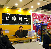 「熱血江湖 Online」を中心に,デベロッパであるKRG,韓国&ワールドワイドパブリッシャのmgame,中国現地パブリッシャの17game.comに話を聞いてきた北京取材だが,エムゲームジャパンの紹介で,現地のインターネットカフェの様子を見てきたので,その印象をお届けする。 出かけてみたのは,北京市内,北京理工大学などいくつかの学校が集まる海淀区の,中規模インターネットカフェ「e国網■」(■は口へんに巴)だ。もともとは電器店だったテナントを改装して開店したものとのことで,垢抜けない感じの雑居ビルに入り,これまた垢抜けない感じの階段を上って店に入る格好だ。 一部大型店舗,フランチャイズ店舗を除くと,中国におけるインターネットカフェは,だいたい雑居ビルの中に店を開いている。繁華街では表通りから1本入ったビルの3階とか,そういうロケーションが多い。また,地方都市では新たに高層マンションが立ち並んだ地区の片隅に,店舗を構えるケースもよく見られる。 このあたりは日本でもそれほど事情は変わらないかもしれないが,あまり賑々しいディスプレイを行わないこともあって,ちょうど1970年代末,タイトーのアーケードゲーム「スペースインベーダー」の流行によって,各地に出来た黎明期のゲームセンターによく似ている。といっても,現在の読者諸氏にどこまで通じるか自信がないのだが,ちょっと薄暗くて,雑然として,殺風景なところが多い,と言えばいいだろうか。