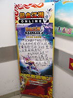 さて,そんなe国網■ではこの日(4月27日),熱血江湖 Onlineの体験プレイイベントが行われていた。店に来る途中の階段に告知用の看板が出ていて,そこには「下午在本網■挙行大規模免費体験包机活動」(午後より,当店にて大規模無料プレイイベントを実施します)と書かれている。確認してみたところ,店内には試遊台が12台ほど用意され,賞品/賞金も出るようだ。 もっとも店員さんに聞いてみたところ,このイベントのメインは,来場者に熱血江湖 Onlineをある程度のキャラクターレベルになるまでプレイしてもらい,それを達成するとその日のインターネットカフェ利用料がタダになるという部分らしい。 実際,見ていると試遊台がほかの席に比べてそれほど混んでいるわけでもない。いやそもそも試遊台といっても,並んだPCの一列を熱血江湖 Online専用に充てているだけであって,通常のスペースと分けられているわけでもない。パブリッシャの人が説明に来たり,MCを付けてステージイベント風にまとめたりといった,いかにもな催しではないようだ。 ただし,インターネットカフェ側には実際にプレイしてくれた人の数に応じて,パブリッシャからキックバックがあるのだという。ゲームショウ「ChinaJoy」でのブースイベントが,割と作品モチーフにこだわらないお祭り騒ぎだったこと,ChinaJoyの会場をうろついていたアマチュアコスプレイヤーに中国モチーフのゲームキャラクターの扮装がほとんど見られなかった(日本製アニメ/ゲームか韓国/欧米風スタイルの人ばかりであった)ことなどを考え合わせるなら,現在の中国オンラインゲーム市場では,イメージやキャラクターを使ったプロモーション策よりも,もう少し即物的かつ実利重視のマーケティングが,オーソドックスな振興策となっているのかもしれない。(Guevarista)