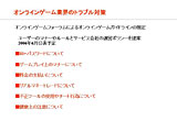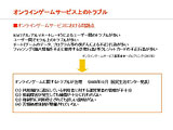 川口氏は次いで,日本国内におけるオンラインゲームサービスに見られるトラブルに話題を転じ,サービス事業者へのヒアリング結果と,国民生活センターに寄せられた苦情をそれぞれ大まかな箇条書きで示した。その場でコメントされていたわけではないが,サービス事業者からはRMT(リアルマネートレード)やプレイヤーモラル,チート,クレジットカード詐欺などが列挙されていたのに対し,国民生活センターに寄せられた意見は,利用規約違反者への管理不十分や,接続障害の補償不備,利用停止処分に対する事由説明の不十分さ,苦情処理体制の未整備など,主にサービス業者に向けられた苦言が挙げられていた。サンプリングの背景が分からないので軽々に判断はできないが,両者は重ね合わせて考えられるべき,オンラインゲーム業界にとっての問題といえるだろう。