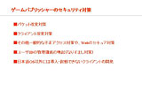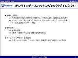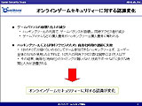 ハッキング,セキュリティの問題について,「リネージュ」における「nProtect」の導入やIDカード制の採用,「スカッとゴルフ パンヤ」における「HackShield」の導入(※)などに触れつつ,川口氏は事業者へのヒアリングに基づき,「なりすましはモラルに依存するためシステムでの抑止には限界がある」「ハッカーと開発会社では多勢に無勢」「OSの脆弱性も問題の一つ」といった論点を提示,差し当たりはセキュリティツールの導入と,開発段階からの統合的な対策実施が必要という見解を示した。