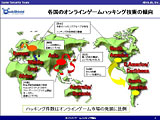 国内事情に続いて,AhnLabの日本法人であるアンラボのエンタープライズソリューション室 河下 聡氏から,世界各国,とくに中国におけるハッキングの動向について説明があった。河下氏はまず,インターネットの普及に伴って情報共有が進み,リバース・エンジニアリング(不正なプログラム解析)技術などが世界中で容易に学べるようになったという現状を示す。 続いて図を示しながら各国のハッキング事情を解説し,欧米では多数のハッカーグループが存在するため技術情報が豊富だが,必ずしもオンラインゲームをターゲットとしておらず,狙う場合もDDoS攻撃などサーバー/ネットワーク周りを対象とするケースが多いと述べた。それに対して中国のハッカーは,欧米の技術を積極的に吸収し,BOTやキーロガー(キー入力追跡による情報の不正取得ツール)の開発とクライアントプログラムの改変に注力,また,サーバーに関してはフリーサーバーを立ててアイテム課金制で運用,独自の事業をしてしまうといった例が多く見られるとした。 韓国でもハッキング問題は深刻だが,こちらはむしろツールの開発者でなく利用者が問題で,マフィアを介した組織ビジネス化しているという。ちなみに日本ではまだまだ個人の“腕試し”に留まっているものの,ビジネス化に向かう徴候が見られる段階らしい。 そして,世界におけるハッキングの趨勢は,「開発の組織化/企業化」「営利追求」「ゲームタイトル専用ツールの登場」に向かっているという。個人が技術力を誇示する意味合いで作っていた状態から,小規模グループを経て組織化/企業化し,ゴールドファーミングに使える“B2Bハッキングツール”が登場。それを会員制で販売する仕組みが整うと同時に,より使いやすいタイトル特化型ツールが普及しつつあるという。