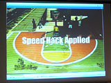 AhnLabによる説明の締めくくりは,同社製品「HackShield」のデモンストレーションとおおまかな開発経緯の説明だ。説明順の都合上先の段落では省略したが,河下氏による解説に先立ってムービーの上映があり,そこでは「FreeStyle」(邦題:クールにバスケFREESTYLE)を題材にしたスピードハックと,メモリ改変による「3ポイントゴール」ハックの阻止,同じく「GunBound」を使ったメモリ改変阻止の様子がデモンストレーションされた。 HackShieldの導入は守秘義務とともに行われるため,多数の実例を挙げられないとのこと。それゆえ実動デモンストレーションはAhnLabが独自に開発した「マインスイーパー」(Windows付属のミニゲーム)の相当品を使い,AhnLab Game Security Magagement Team/R&D Centerの金容燮氏およびアンラボ エンタープライズソリューション室の宋峻和氏の手によって行われた。 ハックツールを使って縦横のコマ数を読み取り,クリック一発でクリアして見せた後,HackShieldがそれぞれコマ数の読み取りとクリアを阻止できることを実演,さらにハックツールが動作し始めて,コマ数が読み取れる状態からHackShieldを有効にして,コマ数の読み取りもクリアもできない状態にできることをアピールした。