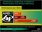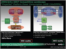 左:本筋とはまったく関係ないが,現在のAMDの屋台骨を支えているサーバー分野での,Core 2ベース次期Xeon(Woodcrest)とOpteronの比較。Pentium 4ベースの旧Xeonの発熱がひどすぎたので,AMDはサーバー市場へ乗り込むことができたといっても過言ではないのだが,次期Xeonはかなりの低消費電力となっている。それでも,Full Buffered DRAMがかなり電力を食っているため,1Wあたりの性能はAMDが上回るという図