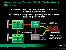ゲーム用としては,2コアのCPU2個で,最大4つのGPU(Quad SLI)を制御する「4X4」の構成が発表された。 現状では,マルチコアCPUがゲームにもたらす恩恵はあまり大きくないものの,最近になってマルチスレッド対応のゲームも登場してきており,今後のゲームではマルチコアのメリットも大きくなっていくと期待される。