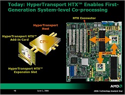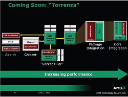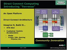 ゲームとは直接関係がないかもしれないが,ちょっと面白いのは,Torrenzaというテクノロジだ。これは,サードパーティの開発したハードウェアをシステムに加えるための方策を用意するもので,Torrenzaでは,いくつかの種類の実装形態が提案されている。 いちばん簡単なのは,PCI Expressなどの拡張スロットに取り付けるものだ。とはいえ,それでは現状の一般的な周辺機器となんら変わりない。 次に,内部バスであるHyperTransportを外部に引き出したHTXスロットに拡張カードを差し込むというタイプ。普通のPCI Expressもかなり高性能なバスなのだが,内部で使用しているHyperTransportとの変換などが必要ないこともあり,より高速でダイレクトな接続が可能になる。 さらに,専用のソケットにチップを取り付けたり,チップセットの内部に特定用途用の回路を埋め込んだり,最終的にはCPU内部に取り込んだりという形態が提案されている。