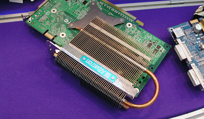 開発中の「第2世代ファンレスソリューション」も見せてもらえたので紹介。この第2世代では,2本のヒートパイプによって,より効率的な冷却が可能になり,写真のようにGeForce 7900 GTのファンレス可を実現するという。なお,ほぼ同じ構造なので写真付きの紹介は控えるが,GeForce 7600 GTについても,この第2世代を採用したファンレスカードにの計画があるという。 なお,これはまだ開発中。上で紹介した第1世代の反響などを見て,改良を加えていく予定とのことだった。