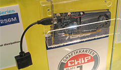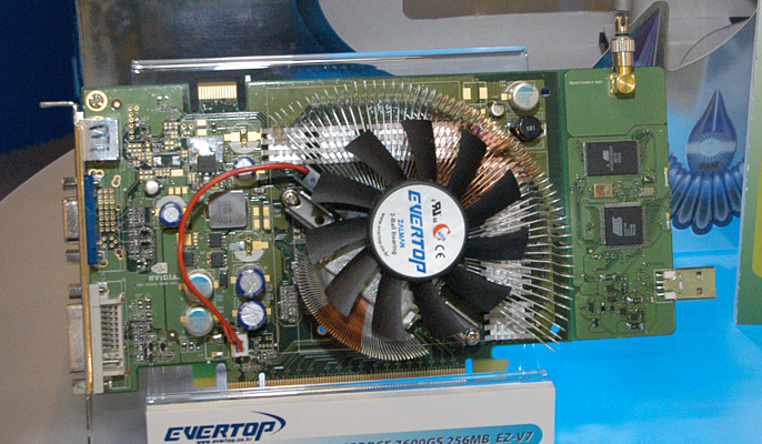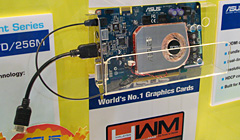 GeForce 7600 GTを搭載し,HDMI出力に対応するモデル。展示では,出力用のHDMIケーブルとデジタルサウンド入力用の光入力ケーブルが取り付けられており,実際の利用イメージをつかみやすくなっていた。