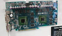 GeForce 7900 GTを2個搭載し,1枚でNVIDIA SLI(以下SLI)を実現するカードだ。「Galaxy Masterpiece」という高級ブランドの製品とされ,10層基板に,1.2ns品のグラフィックスメモリチップ,高品位の部材を採用。電源周りもデザインし直しているとのことだった。チップクーラーは開発中だが,次に紹介するデュアルGeForce 7600 GTカードと似たような外観のものになるという。